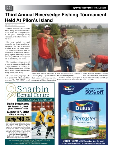 11.21 pounds with 5 bass, was Mike like to see more entries next year in the Anyone is welcome to participate in Rivers at 613-360-4398 or Trevor Mayer