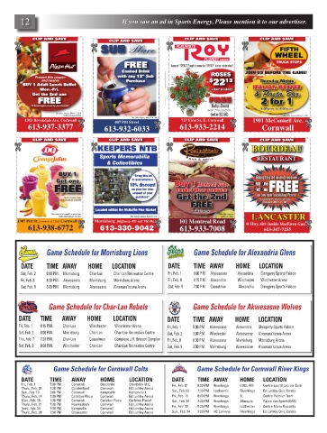 Sat, Feb. 2 8:00 P.M. Morrisburg Char-Lan Char-Lan Recreation Centre Fri, Feb. 1 8:00 P.M. Akwesasne Alexandria Glengarry Sports Palace