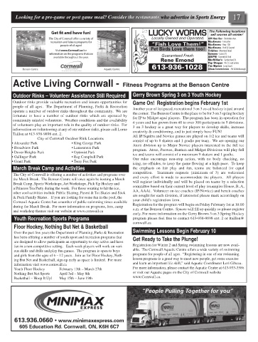 and workshop themes visit our website at www.cornwall.ca a.m. at the Benson Centre. Spaces will fill up quickly so please register