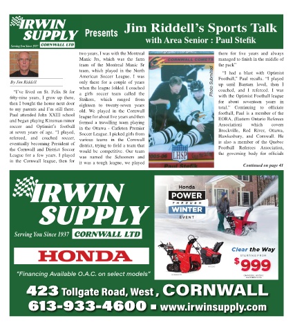 refereed, and coached soccer, various teams in the Cornwall Hawkesbury, and Cornwall. He