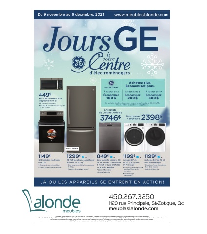 L’événement « Jours GE à votre Centre d’électroménagers GE » se déroule du 9 novembre au 6 décembre, 2023inclusivement et s’applique aux électroménagers GE et GE Profile sélectionnés.