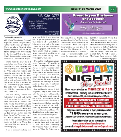 Continued from page 26 were paid. I didn’t want to get cut the road, Don and Brenda would Schnitzel’s restaurant, where they