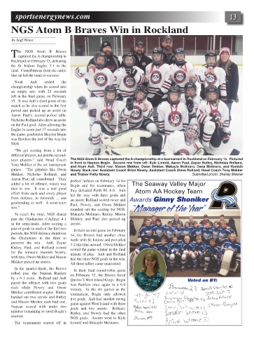 year players,” said Head Coach The NGS Atom B Braves captured the A championship at a tournament in Rockland on February 15. Pictured