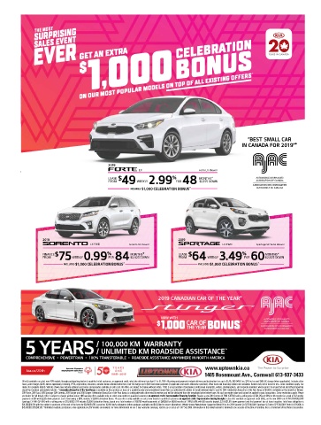 2019 Forte, 2019 Soul, 2019 Sportage 2019 Sorento, 2019 Stinger and 2018 Stinger. Celebration Bonus/Car of the Year Bonus is combinable with other retail incentives and will be deducted from the negotiated price before taxes. No cash surrender value and cannot be applied to past transactions. Some restrictions apply. Please