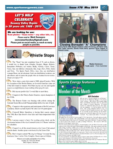 Akwesasne Indians Jr B or the Cornwall Celtics Jr C Teams’ websites and Bruce played both football and rugby at Bishop’s University. Bill retired in 2009 after