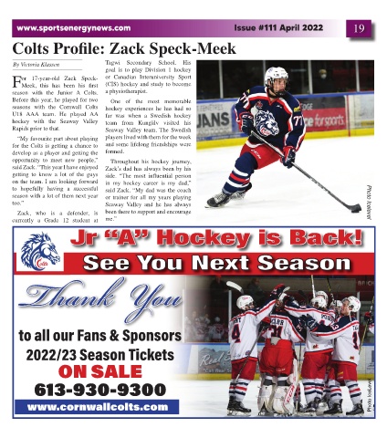seasons with the Cornwall Colts hockey experiences he has had so