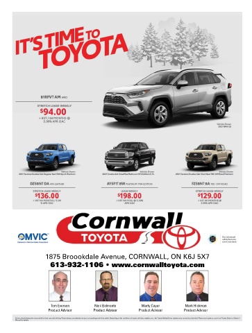 1875 Broookdale Avenue, CORNWALL, ON K6J 5X7 613-932-1106 • www.cornwalltoyota.com Tom Everson Nick Belmonte Marty Cayer Mark Hickman Product Advisor Product Advisor Product Advisor Product Advisor